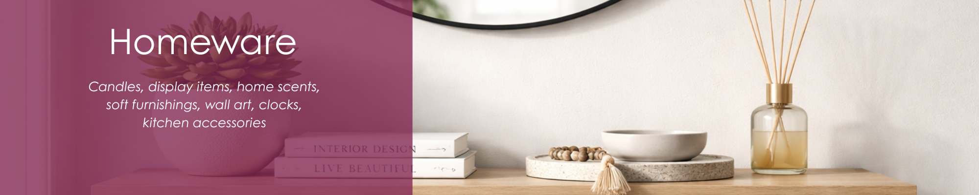 Our Range of home accessories, furnishings, and decor items are perfect to enhance and beautify one's living space. This includes items such as Candles, soft furnishings, home scents, kitchenware, and decorative accents. Ranging from practical items like kitchen gadgets and storage solutions to decorative pieces like cushions and artwork. Investing in homeware can help create a welcoming aesthetic and living space that reflects your personal style and taste.