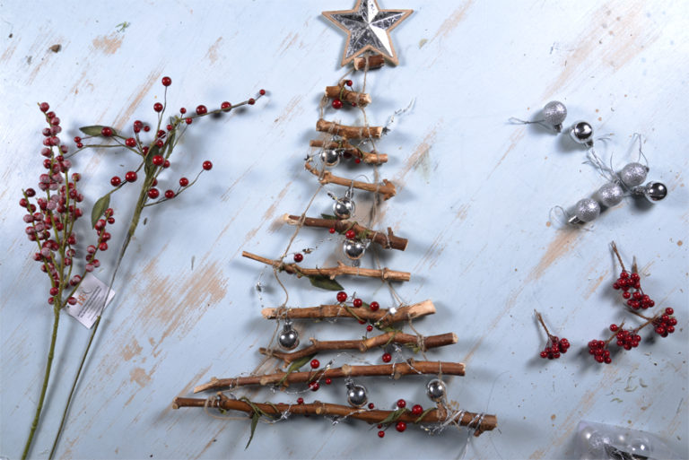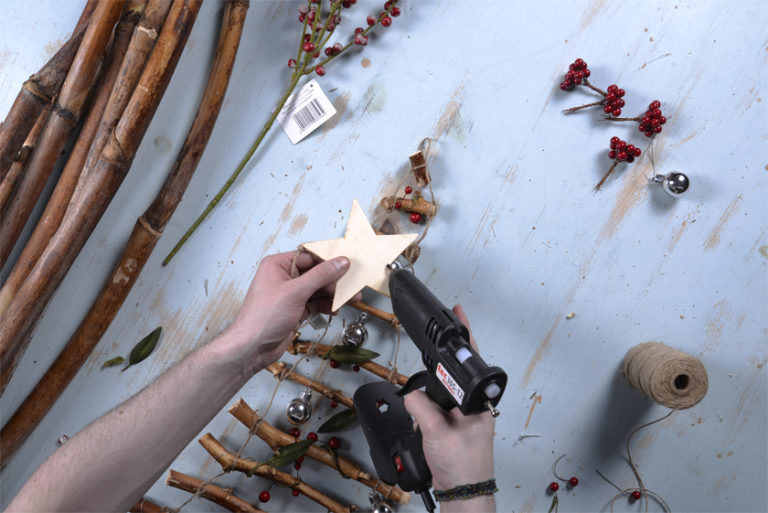 Once the string is secured you can start adding decorations to the sticks. Berry picks, small baubles and lights can be wrapped around the sticks to add a real festive vibe to this decoration. You can really go to town on the decoration if you wish.