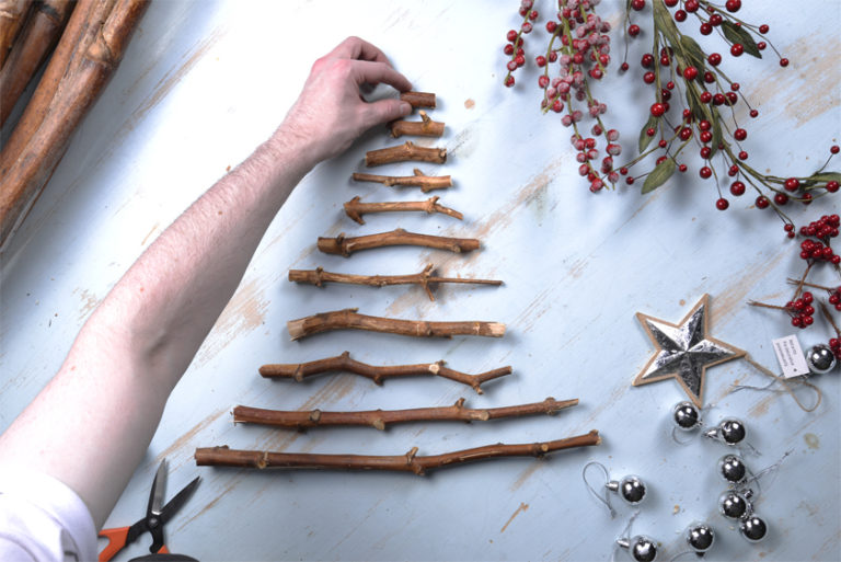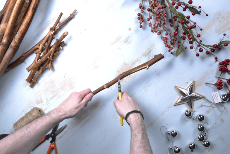 Begin by cutting the sticks into a series of different sizes, we would recommend you aim for about eleven different lengths as this will create a good sized tree. Ensure that the sticks range from short to long in a consistent way, meaning there will be flow from each length to the next.