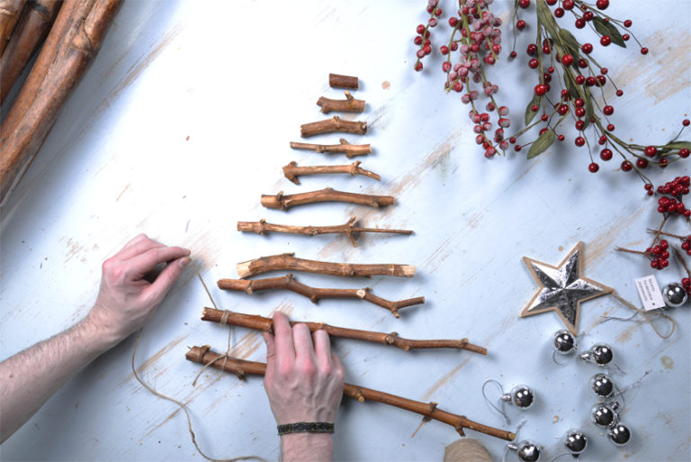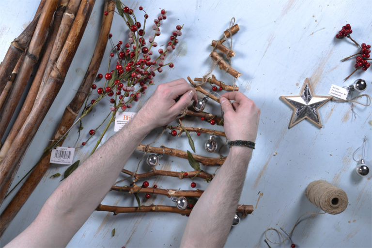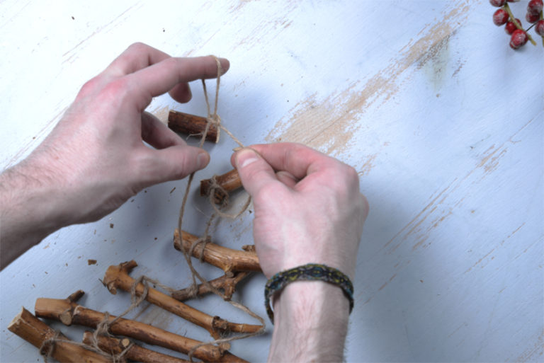When you’re happy with the placement of the sticks start tying them together so that they hang in a Christmas tree shape. Starting at the bottom, tie the end of the string to one end and begin attaching more string to the rest of the sticks moving upwards.