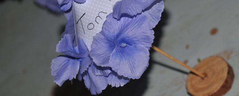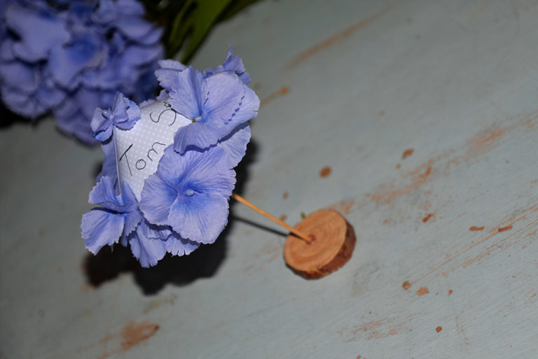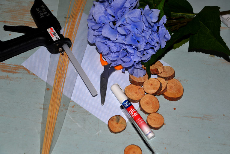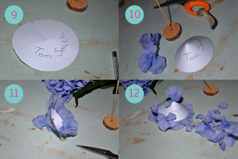 Cutting whole heads from the hydrangea, glue them in place on the decorative side of the cone. Avoid covering the name. Glue your finished cone to the top of the stick to create your finished umbrella!