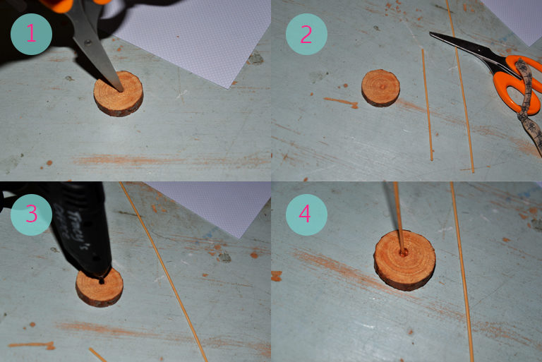 Add a drop of glue into the hole in the wood slice. Place your cut wooden stick into the glue and hold in place until the glue has dried.
